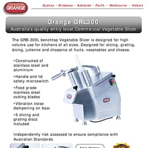 Customer Benefits: The Grange GRL300 offers unmatched versatility and precision for commercial kitchens, enabling chefs to prepare ingredients more efficiently than ever. Ideal for restaurants, catering services, and food preparation facilities, it not only simplifies food prep but also enhances the overall presentation and quality of dishes.