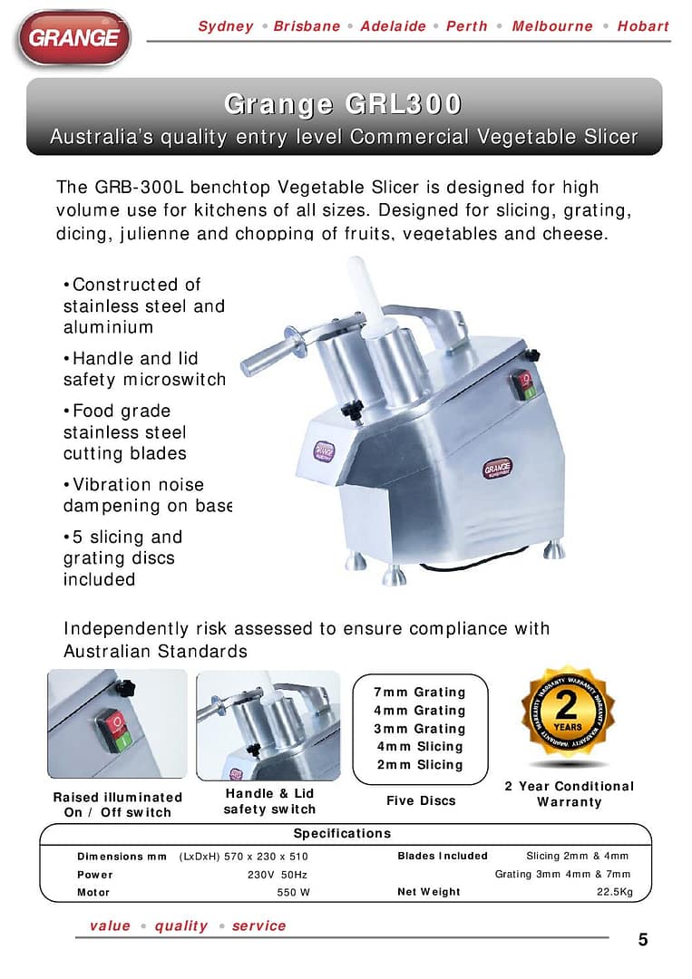 Main Description: Introducing the Grange GRL300, your comprehensive solution for slicing, grating, dicing, julienne, and chopping a wide array of fruits, vegetables, and cheeses. Crafted from high-quality stainless steel and aluminum, this commercial-grade slicer is designed to withstand the rigorous demands of professional kitchens. The GRL300 comes equipped with a handle and lid microswitch for enhanced safety, while its food-grade stainless steel cutting blades ensure precise cuts every time. Experience significantly reduced vibration noise thanks to the dampening technology on the base, making for a quieter kitchen environment. Included are five versatile slicing and grating discs (2mm and 4mm slices; 3mm, 4mm, and 7mm grates) to accommodate a variety of preparation needs. With its 2-year conditional warranty, this durable and efficient vegetable slicer is an indispensable tool for any commercial setting.