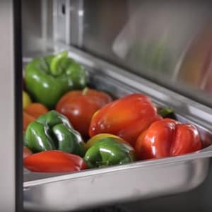 - Construction: 304 stainless interior & exterior; rounded corners; fan-forced cooling; auto defrost; wired mid shelf; GN pan rails; self-closing dual doors with stay-open position; castors as standard.
