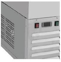 - Construction: 304 stainless steel body; 2 hinged glass doors with magnetic gaskets; 4 epoxy-coated shelves; LED interior lighting; fan-forced cooling; slide-out compressor; swivel castors