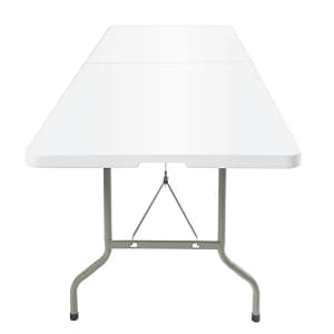 - Construction: White polyethylene top; powder-coated steel legs; carry handles; non-marking feet
