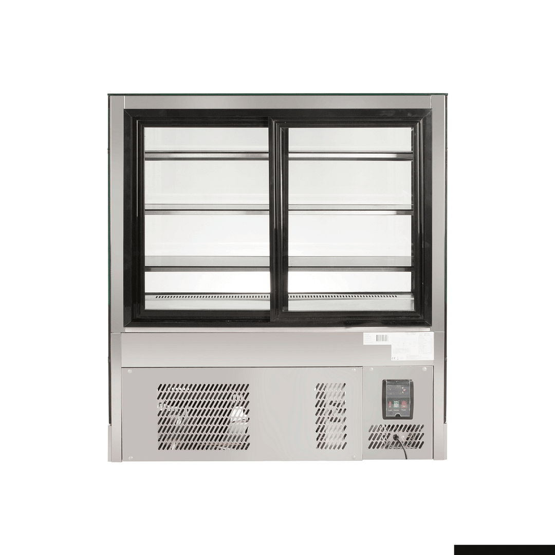 - Construction: Heated double-glazed glass, stainless steel mirror base, ventilated cooling, Secop compressor, LED lighting, auto defrost, rear sliding doors, castors