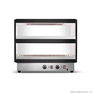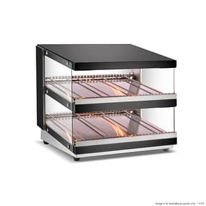 The HWB2-65 combines dual-tier stainless-steel shelving, a smooth food slide guide, and full glass visibility in a black steel frame, allowing clear presentation and consistent heat retention for pastries, snacks and plated meals.