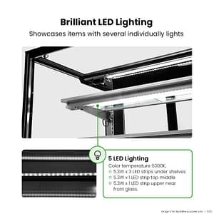 - LED Lighting: 5 total – 3 under shelves, 1 top, 1 upper front (6300K cool white)
