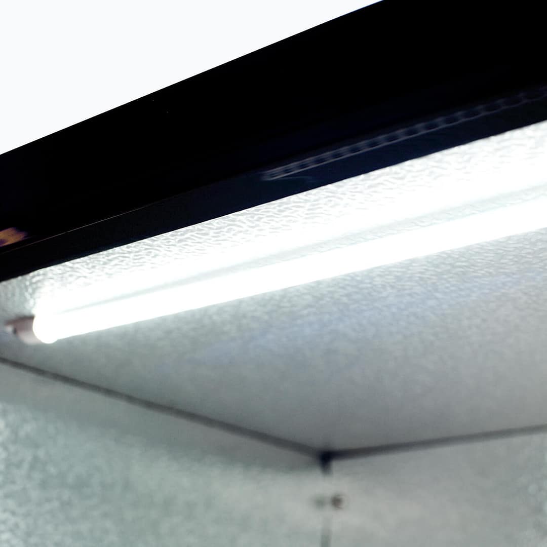 - Construction: Black finish; 2 double-glazed sliding doors with self-closing & locks; LED interior lighting; narrow wired adjustable shelves (2 per door + base); digital controller; R600 refrigerant; adjustable feet