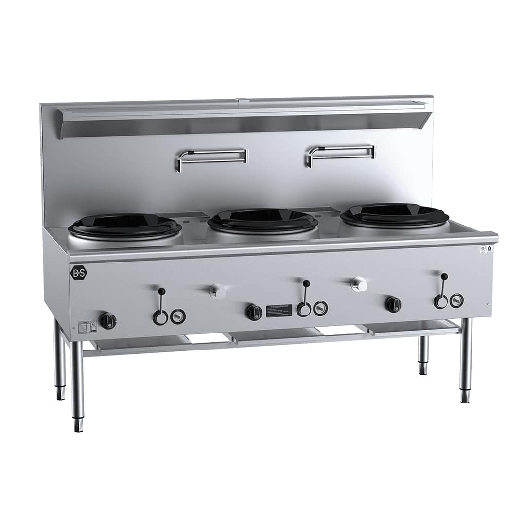 - Configuration: Three wok holes with long skirt cast iron unflued rings (Ø 340 mm)