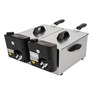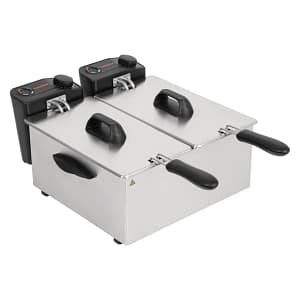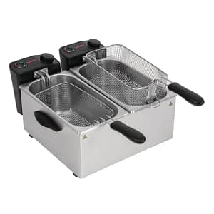 Constructed with a durable stainless-steel exterior and equipped with removable inner pots and control panels, this fryer is as easy to clean as it is to operate. It includes variable temperature control, a safety cut-out feature, and comes with baskets and lids to ensure safe and efficient frying.