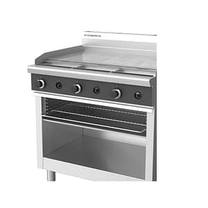 - 900mm Gas Griddle Toaster: Mounted on an open cabinet base for convenient storage and access.