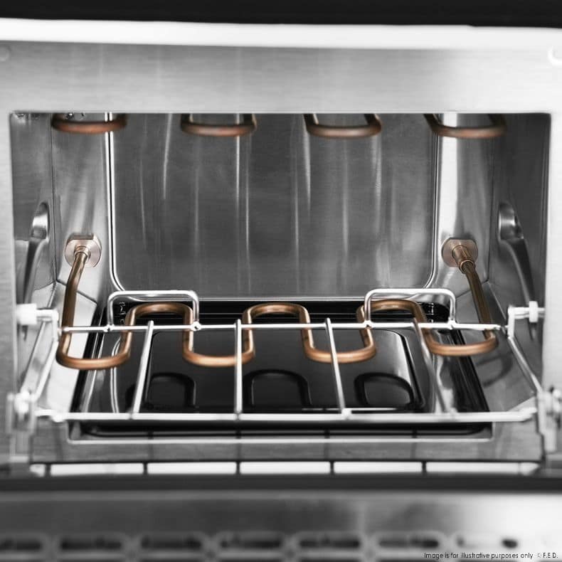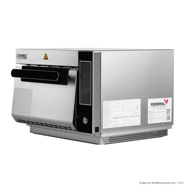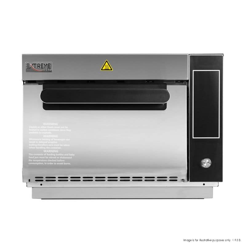Combining microwave power and top/bottom radiant heat, this 3.3 kW hybrid oven achieves professional results up to 10× faster than standard convection ovens — perfect for cafés, QSRs, and convenience outlets.