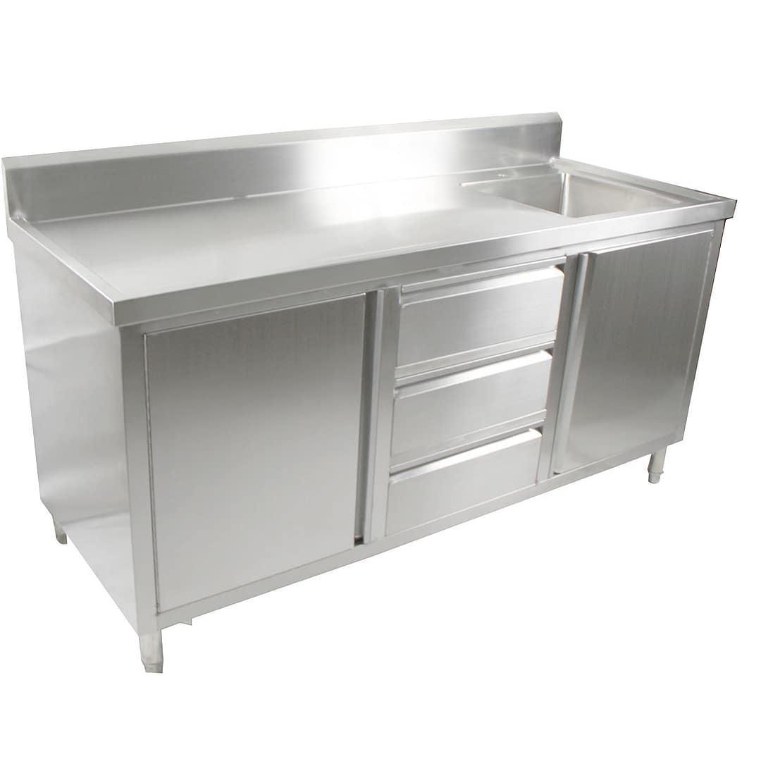The FED SC-6-1800R-H Modular Stainless Steel Cabinet is the go-to solution for restaurants, hotels, and food service venues needing high-capacity washing, enclosed storage, and long-lasting durability. Featuring a right-side sink, full-height splashback, and integrated doors/drawers, this fully welded and pre-assembled unit is ready for heavy use in demanding environments.