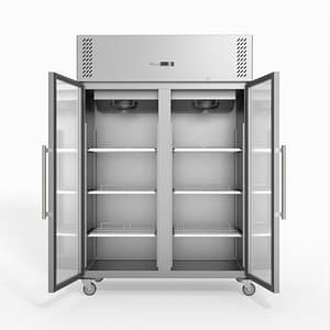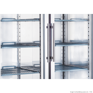 - Doors: Two full glass, self-closing, lockable, heavy-duty magnetic seals
