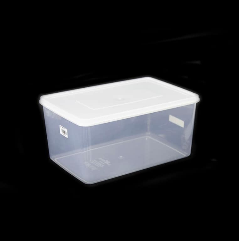 This is a clear food storage box with a white cover, offering a generous capacity of 9 liters. It measures 300mm in length, 200mm in width, and 150mm in depth. Constructed from durable polycarbonate, it is designed to withstand rigorous kitchen use while providing easy visibility of its contents.