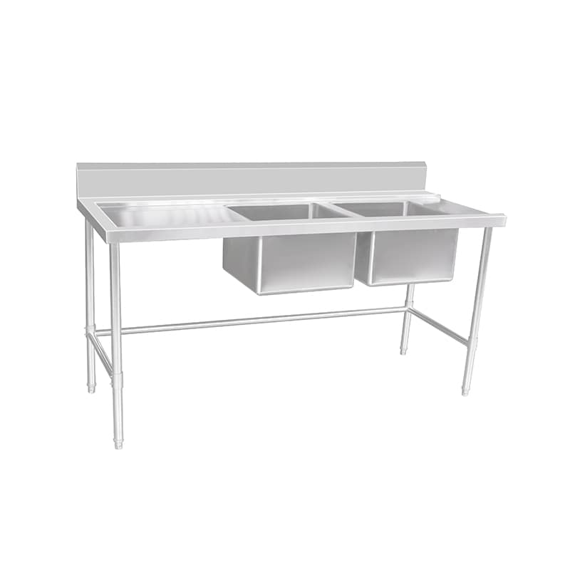 The Kitchen Knock 631102 is a robust double sink dishwasher inlet bench with a left-hand bowl layout. Constructed from 1.2mm 304-grade stainless steel, it includes a 150mm splashback, stainless legs with brace, and durable welded sinks—ideal for foodservice environments requiring hygiene, efficiency, and long service life.