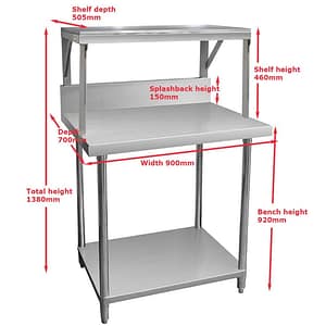The Gasmax SMB-7-0900 is a robust heavy duty salamander bench designed to support salamanders and other catering equipment. With a 900mm wide × 700mm deep benchtop and reinforced stainless steel shelf braces, this bench delivers durability, stability, and hygiene for professional foodservice environments.