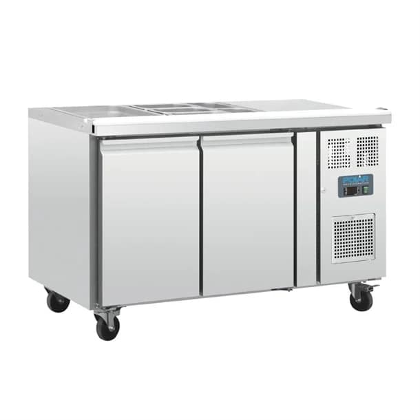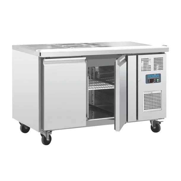 At KW Commercial Kitchen, we supply the Polar FT281-A – a commercial two-door counter fridge combining generous 205-litre storage with a GN-compatible prep top. Ideal for fast-paced food prep areas where freshness, hygiene, and space efficiency matter.