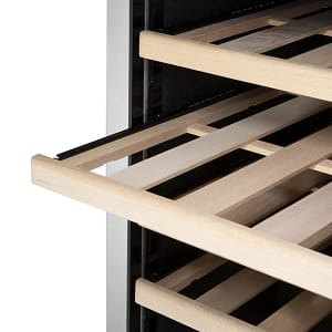 The wooden shelves are fixed to accommodate standard 750ml bottles. For larger formats, some shelves can be removed, but this will reduce capacity.