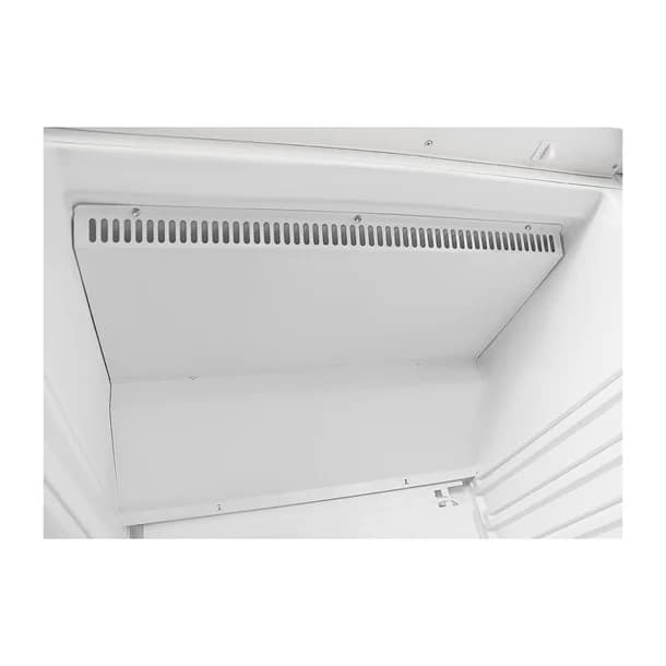 - Construction: White steel body; lockable reversible door; 2 adjustable shelves + 1 half shelf; static cooling; manual defrost