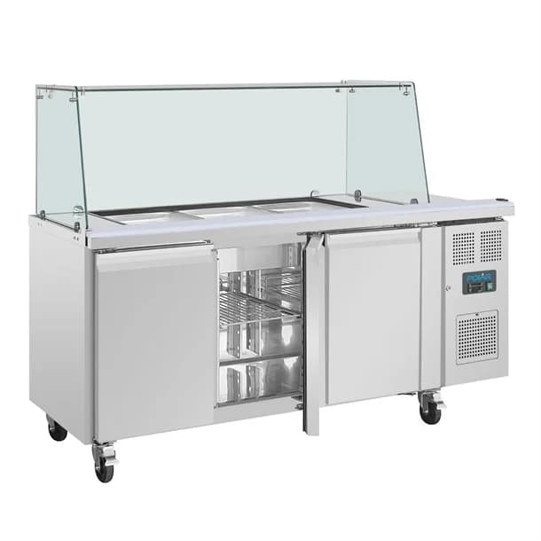 Keep your most-used ingredients perfectly chilled and easily accessible with the Polar U-Series GN Saladette Counter with Square Sneeze Guard. This three-door saladette counter combines a versatile gastronorm-compatible top with a spacious triple-door base, providing superbly flexible prep and storage solutions for any busy professional kitchen. Whether you’re making salads, pizzas, or sandwiches, the Polar saladette counter offers the capacity, reliability, and performance you need to speed up prep while promoting excellent hygiene.