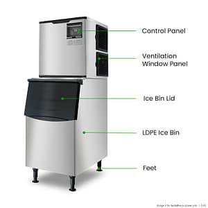 - Construction: Stainless steel with LDPE ice bin; digital control panel; Morrill water pump; Italian Aspera compressor; Danfoss expansion valve; Japanese Saginomiya solenoid