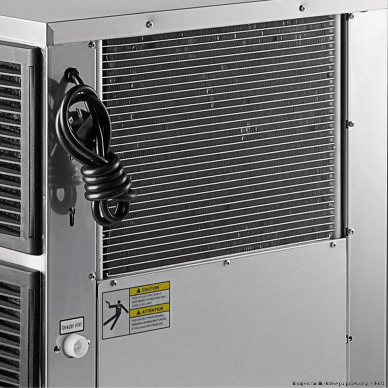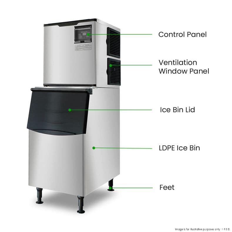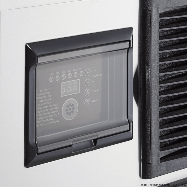- Construction: Stainless steel with LDPE ice bin; digital control panel; Morrill water pump; Italian Aspera compressor; Danfoss expansion valve; Japanese Saginomiya solenoid