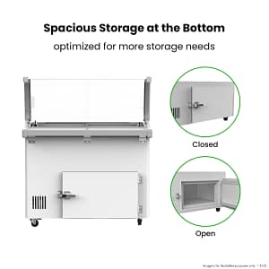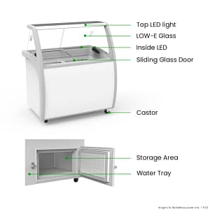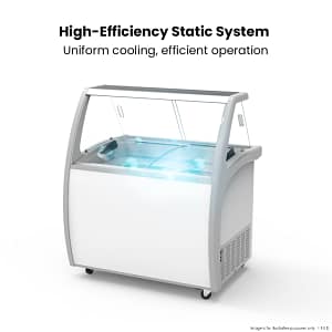 Featuring an energy-efficient R290 refrigerant system, static cooling, and a -18°C to -22°C temperature range, the SD-325P ensures smooth, consistent freezing. It’s mounted on four heavy-duty castors for easy mobility and includes a lockable sliding glass lid for secure storage during off hours.