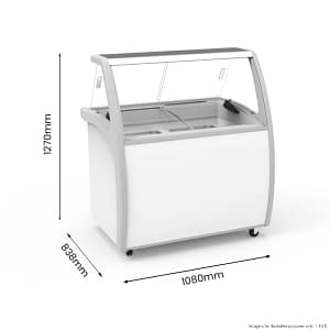 The display holds 6 x 5L stainless steel pans, making it suitable for up to 6 gelato or ice cream flavours.