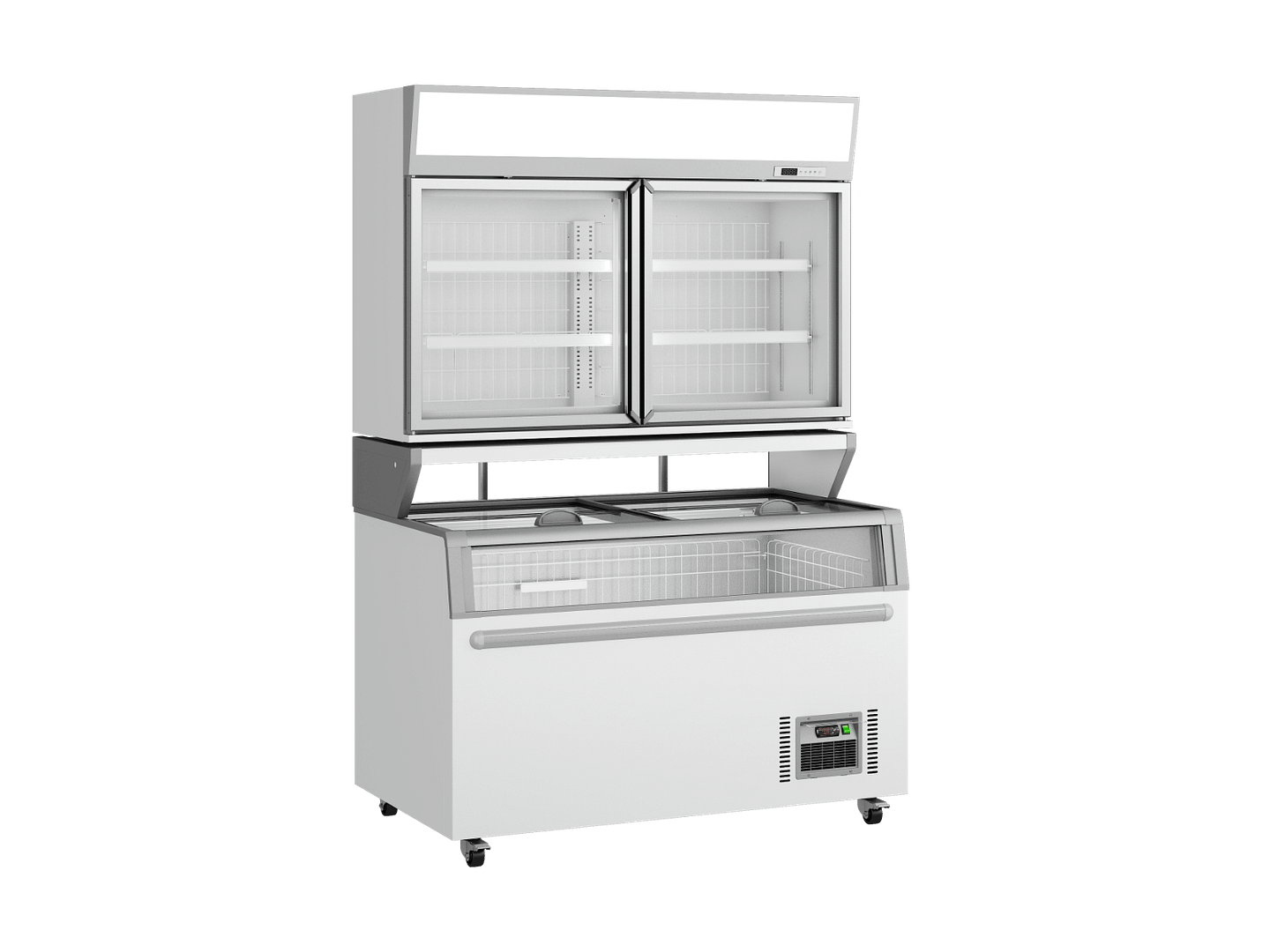 The ZCD-TD145 features a top hinged-glass freezer with triple-glazed self-closing doors and an illuminated advertising canopy, paired with a bottom sliding-glass chest freezer. Powered by eco-friendly R290 refrigerant, it combines fan cooling up top with static cooling below for reliable operation.