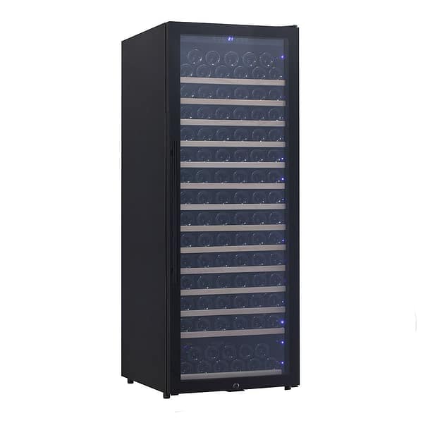 Stores up to 166 standard bottles. Adjustable beech shelves accommodate Bordeaux, Burgundy, Champagne, and larger bottle formats.