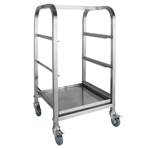 The Vogue CL269 is a durable 3 tier glass racking trolley made from stainless steel. Designed to hold three 350 × 425 mm baskets, it allows staff to transport glassware quickly and safely between glass washers and bar service areas.