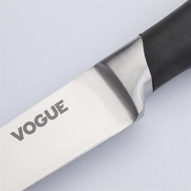 Peel or chop fruits and vegetables in complete comfort – this soft grip paring knife from Vogue is kind on your hand while delivering the ultimate cut every time. The high carbon stainless steel blade peels and slices with ease, while a durable wide bolster ensures the knife is perfectly balanced and weighted. The ergonomically designed handle is comfortable to hold during long and busy shifts, helping you prepare larger quantities of ingredients in less time. Handwashing is recommended for this 90mm utility knife.