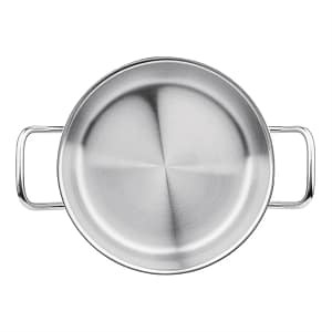 The Vogue T149 combines 18/10 stainless steel with a 6mm aluminium base encased in 430 stainless steel for superior strength and heat distribution. The curved pouring lip ensures drip-free serving, while the dual stay-cool handles provide safety and control when transferring or lifting.