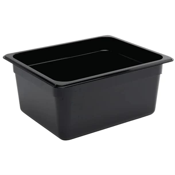 Store your food with confidence using the Vogue Black Polycarbonate GN Pan 1/2 150mm (Product Code: U460). This black gastronorm container offers an 8.8L capacity and is designed for durability, practicality, and safety in busy commercial kitchens.