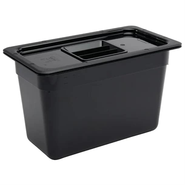 Store your food confidently with the Vogue Black Polycarbonate GN Tray 1/3 200mm (Product Code: U465). This black gastronorm container provides a 7.5L capacity and is designed for durability, practical use, and safety in commercial kitchens.
