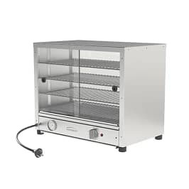 A: It features a mechanical thermostat to control temperature between 70°C – 80°C, ensuring food remains in the safe holding zone. The toughened glass and double-skinned cabinet also provide a hygienic environment.